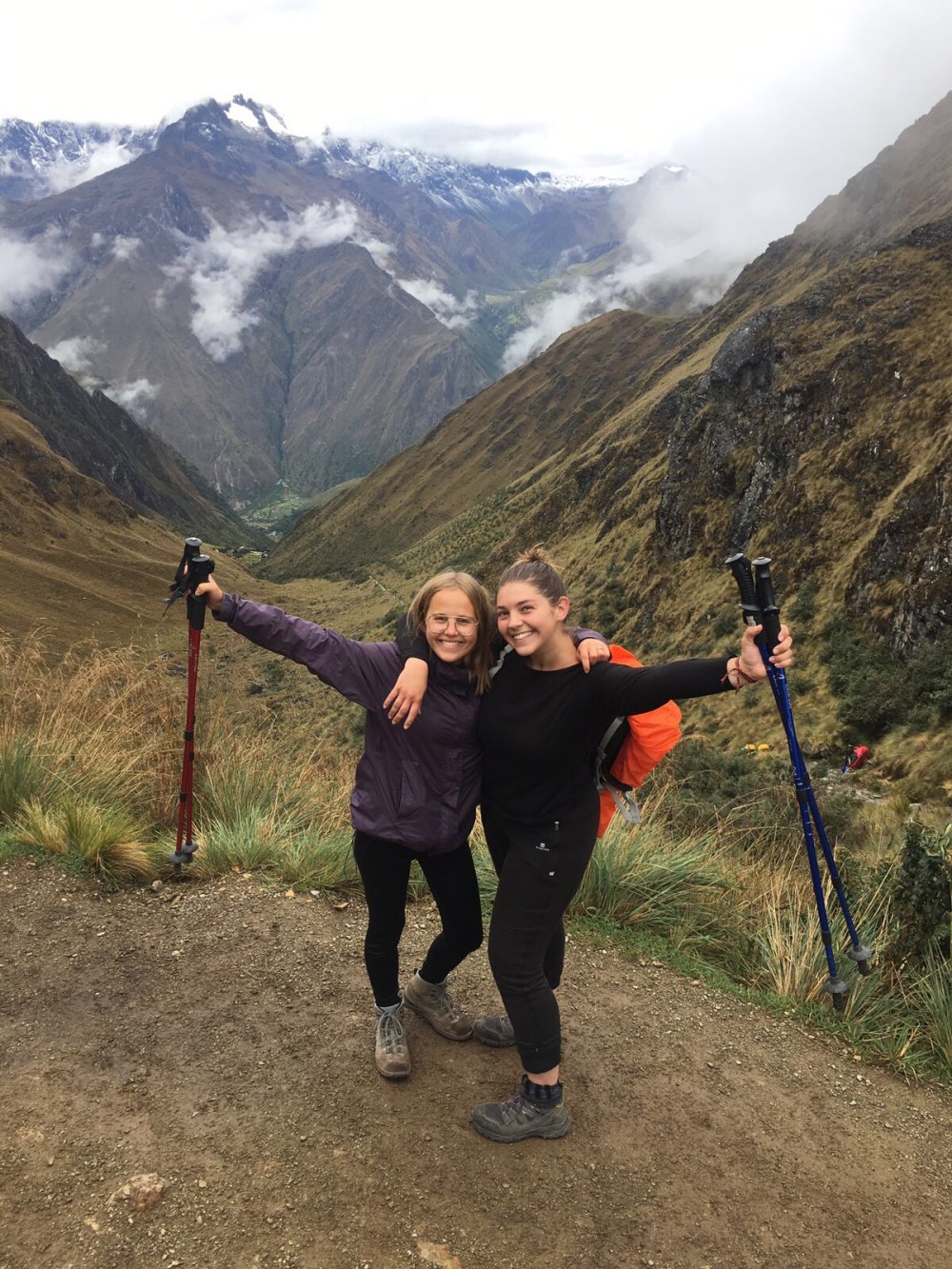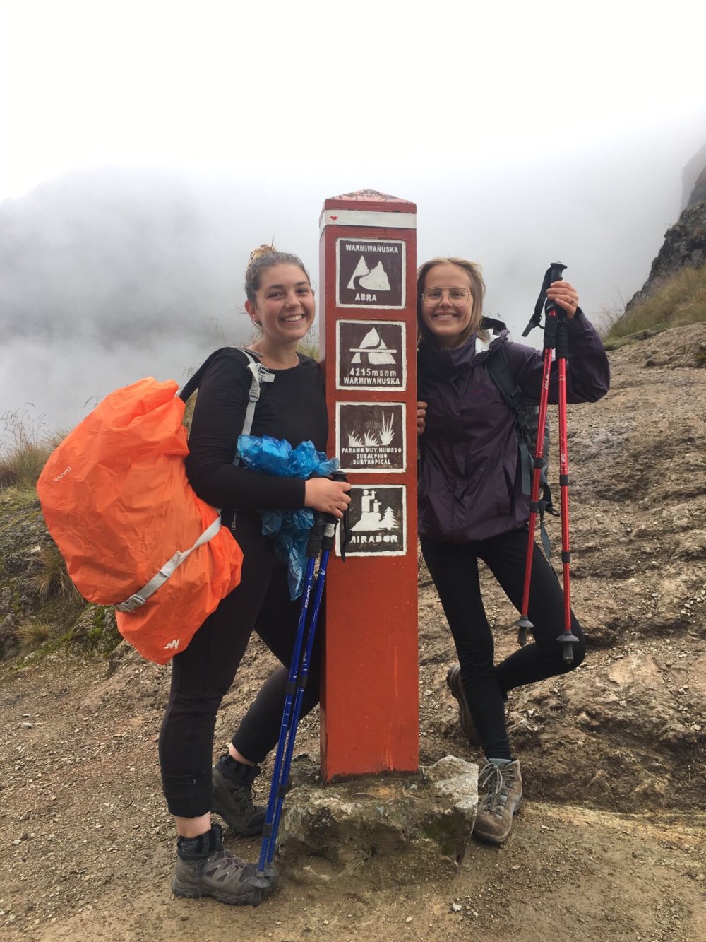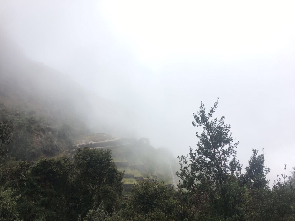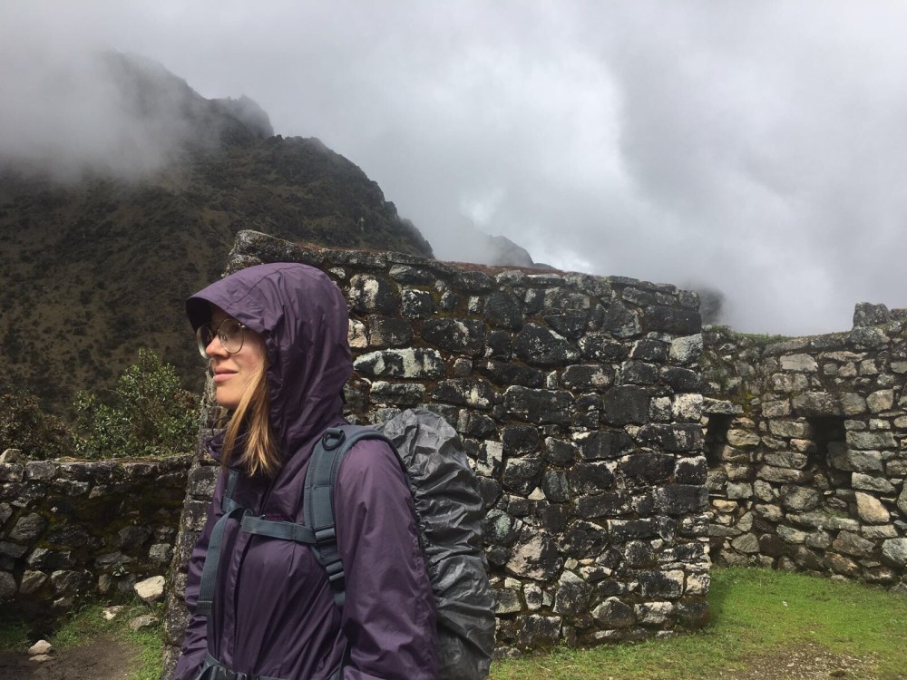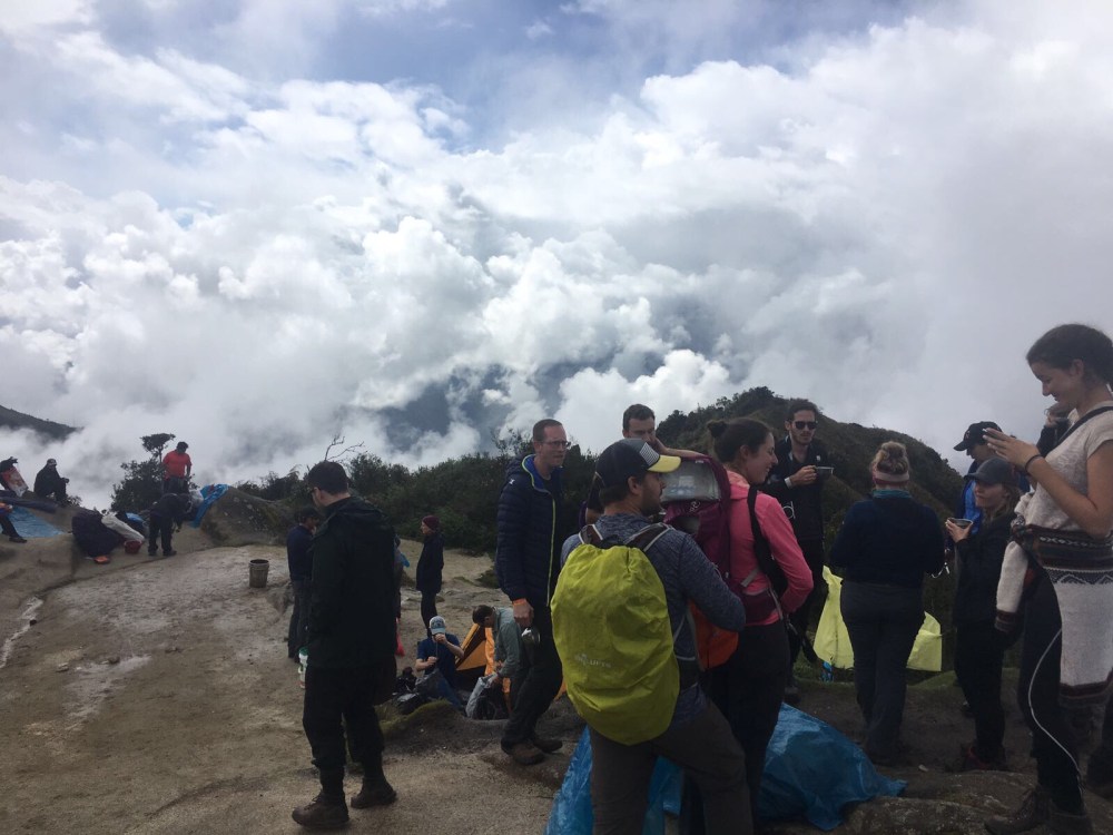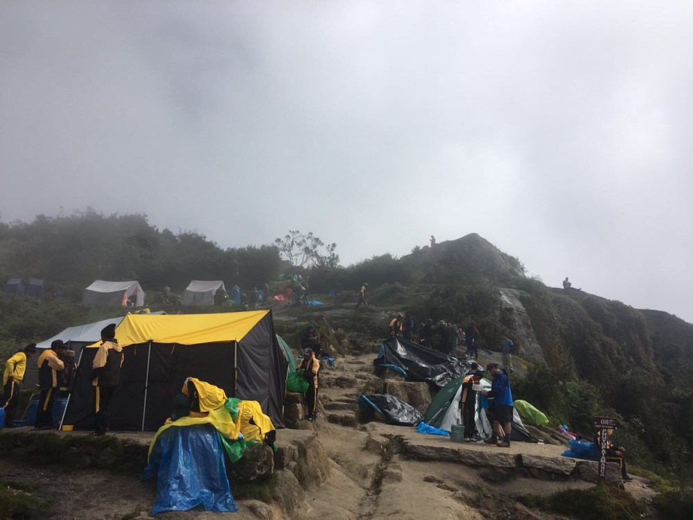 Le lendemain, nous nous réveillons à 5h du matin. Nous devons partir vers 6h. C’est le deuxième jour, celui où l’on va faire 1250 mètres de dénivelé. Personne n’a le même rythme que moi alors je marche seule durant presque toute la journée. Les porteurs très chargés nous dépassent chacun leur tour, nous sommes tous impressionnés. Il pleut énormément et j’abandonne l’idée de garder ma capuche sur la tête : je suis trempée de toute façon. Nous arrivons enfin au dead woman’s pass, à 4215 mètres d’altitude. La pluie s’arrête enfin. À partir d’ici, il nous reste environ 2 heures de descente jusqu’au campement. Le plus dur est derrière nous. Nous y arrivons finalement. Il s’agit d’un campement qui regroupe les équipes de différentes agences de Cusco. Il y a des dizaines de tentes et un petit bâtiment dans lequel se trouvent les toilettes et la douche. Annie et moi décidons d’aller nous doucher. L’eau est gelée mais nous sommes contentes de nous sentir propres! Nous passons la soirée de la même manière que la veille et allons dormir tôt. Les 8 heures de marche et l’attitude nous ont fatiguées.